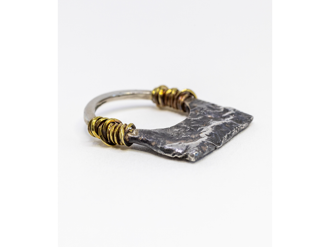 Anillo plata envejecida, fuego controlado y embarrilado bronce.