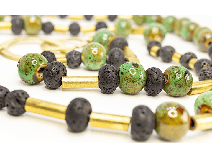 Collar cerámica verde, piedra volcánica y bronce. Largo 80 cm.