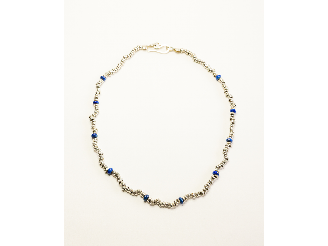 Collar mostacillas de plata 950 y lentejas de Lapislázuli. Largo 50 cm.
